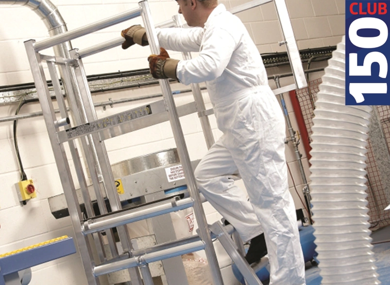 A folding, stabilised mobile access podium with slip-resistant front feet and guardrails.