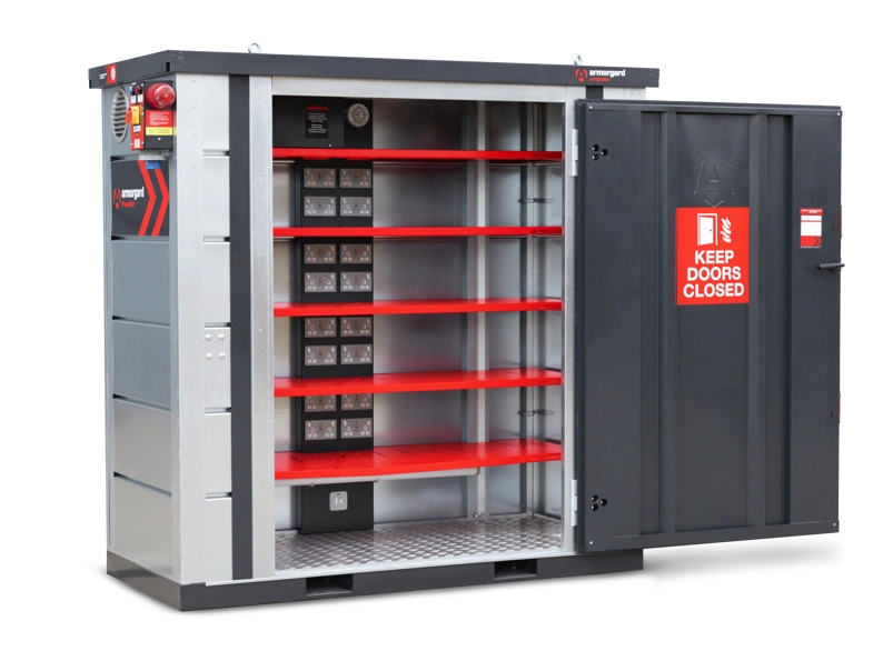 The Armorgard Power‑Stor FR100‑P 1m deep battery charging unit is a secure, walk‑in solution designed to safely charge and store multiple lithium‑ion tool batteries on site, combining robust protection, practical organisation, and advanced fire safety.