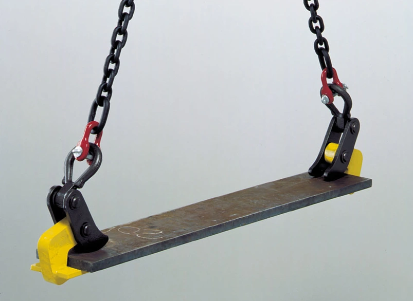 A pair of clamps, when used with a two-legged chain sling, is ideal for handling small plates. For lager plates, it's advisable to use two pairs of clamps with a spreader beam. These clamps are equipped with smooth jaws by default, with an option for hardened steel serrated jaws for specialised applications. They also feature a locking mechanism for added security.Â