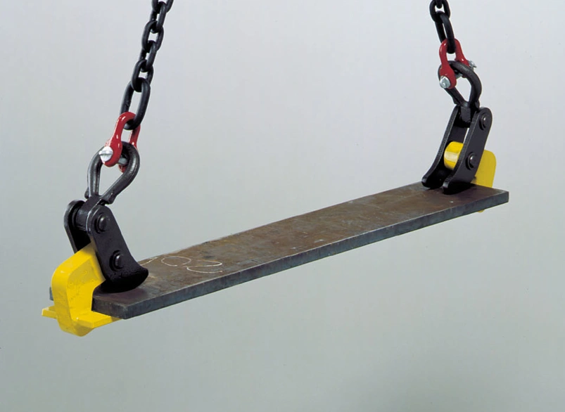 A pair of clamps when used with a two-legged chain sling, is ideal for handling small plates. For larger plates, it's recommended to use two pairs of clamps with a spreader beam. These clamps come with smooth jaws as standard, and hardened steel serrated jaws are available for specialised applications. They also include a locking mechanism for added security.