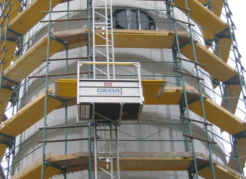 Rack and pinion hoists are designed for the transportation of heavy goods. This small hoist is ideal for scaffolders and construction workers. The lightweight platform (only 44kg) can be turned by 90o to the left and right. The entire unit only requires an area of 1.5m x 1.5 m, making it possible to load the hoist parallel to the building without any problems.