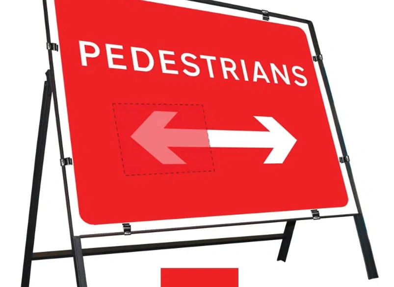 The Pedestrians Left / Right Reversible Clipped Metal Road Sign (600 × 450mm) is a durable, high-visibility directional sign designed to guide pedestrian traffic safely around roadworks and closures. Built to UK standards for temporary traffic management.