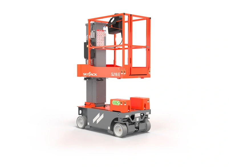 The Sky Jack SJ16 self-propelled vertical mast lift offers a compact footprint and superior maneuverability.